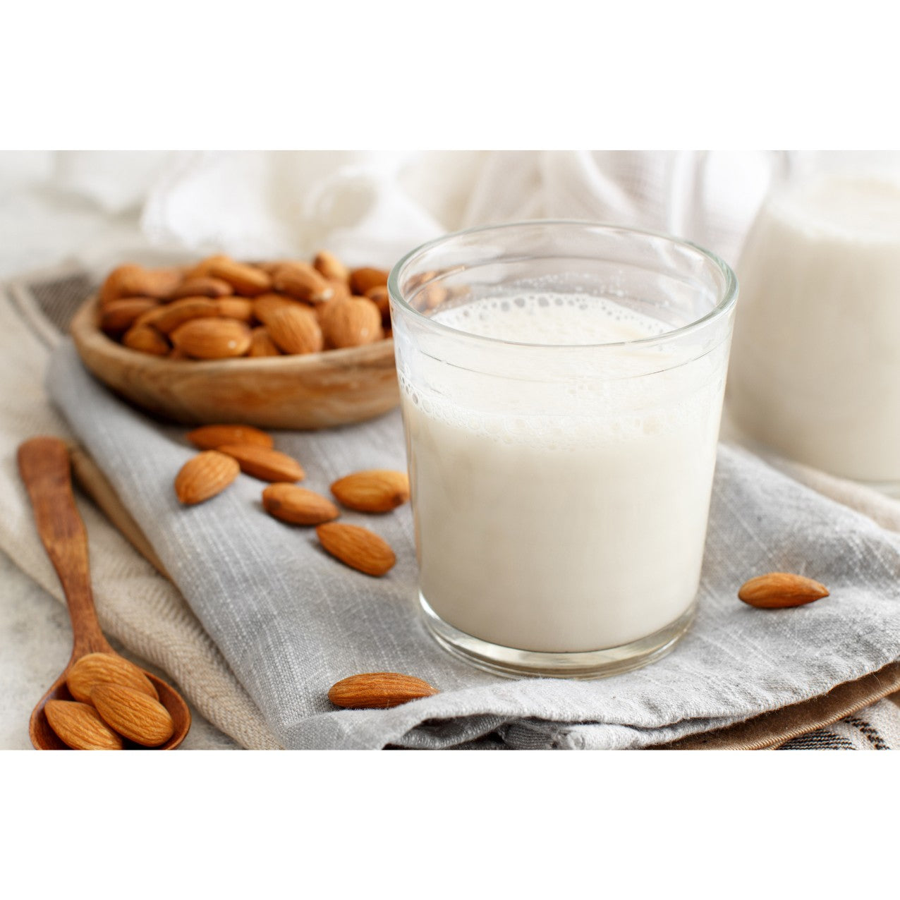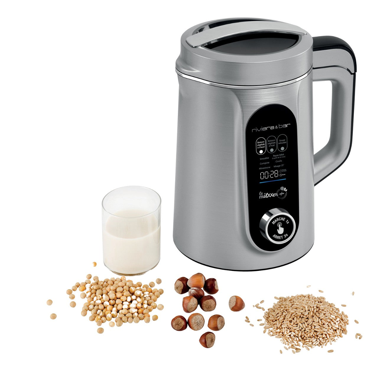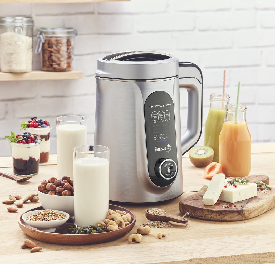 Zilveren keukenrobot, glas melk, soja, hazelnoten, granen.